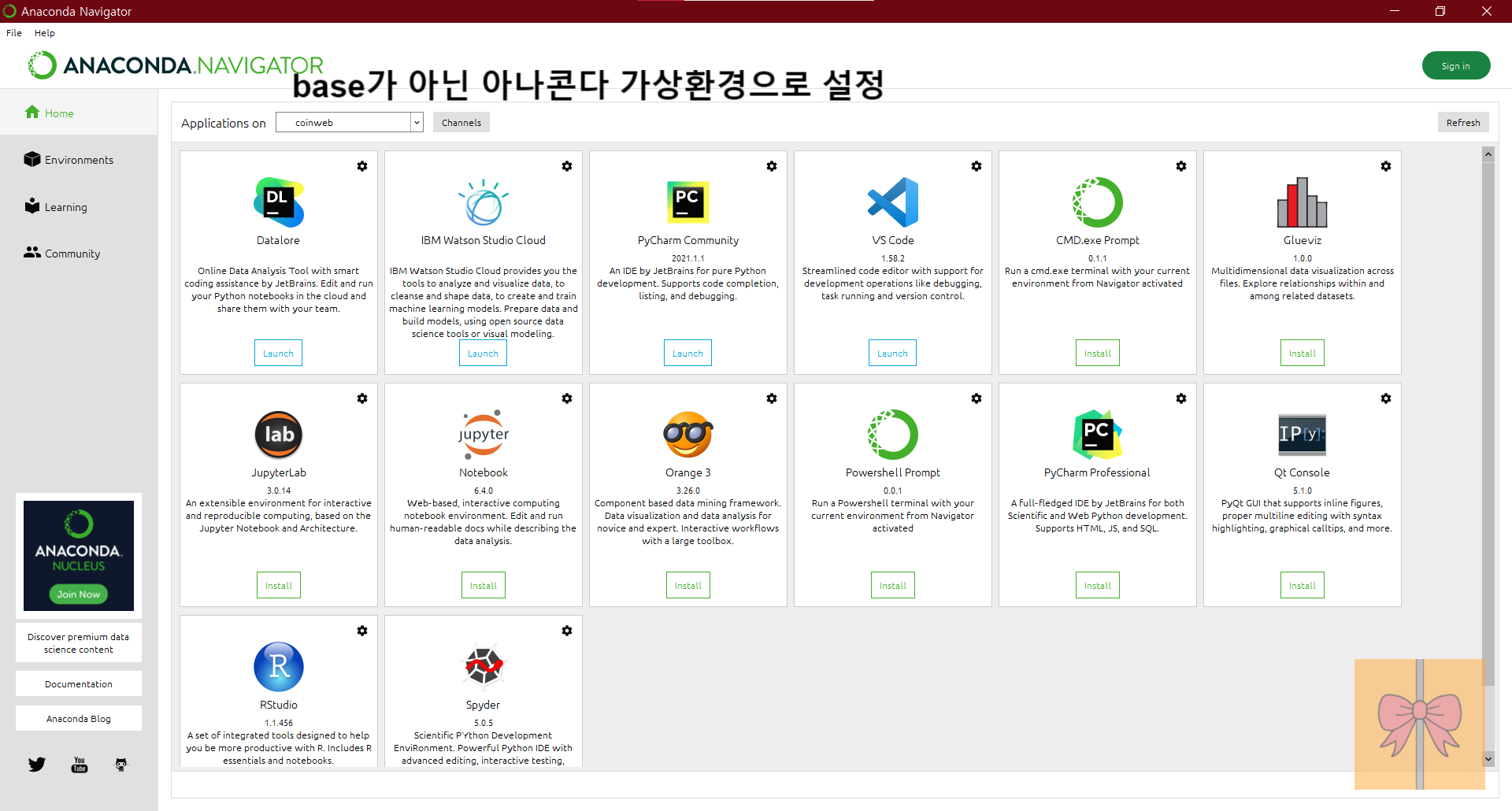 1. 아나콘다 내비게이터를 열어서 좌측 상단에 Application on 부분을 base가 아닌 아나콘다 가상 환경으로 설정합니다. (저는 coinweb) (이 과정은 굳이 필요 없는 것 같기도 합니다. 그냥 바로 파이참 실행시키셔도 무방합니다.)