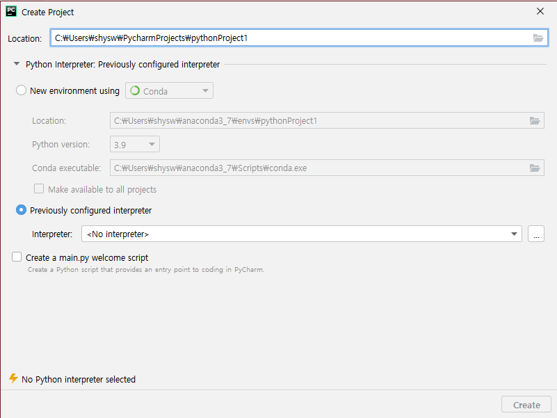 5. 그러면 가상 환경 설정이 완료되었습니다. Create를 누르고 지정한 아나콘다 가상환경 아래 새 프로젝트를 진행하면 됩니다. 끝!
