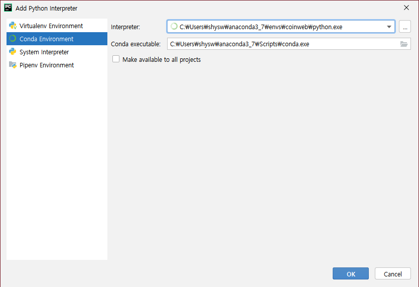 4. Interpreter 우측에 ... 클릭해서 c:\Users\사용자\아나콘다\envs\가상환경\python.exe를 찾아줍니다. 만약에 python.exe가 바로 보이지 않는다면 가상 환경 폴더 아래 bin 폴더에 있을 수도 있습니다.