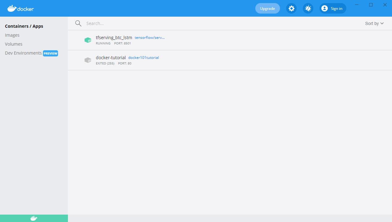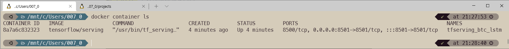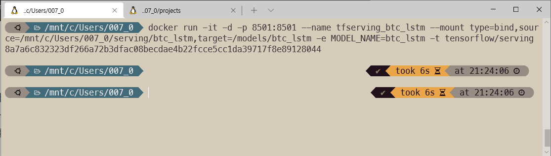 $ docker run -d -p 8501:8501 --name tfserving_btc_lstm --mount type=bind,source=/mnt/c/Users/007_0/serving/btc_lstm,target=/models/btc_lstm -e MODEL_NAME=btc_lstm -t tensorflow/serving